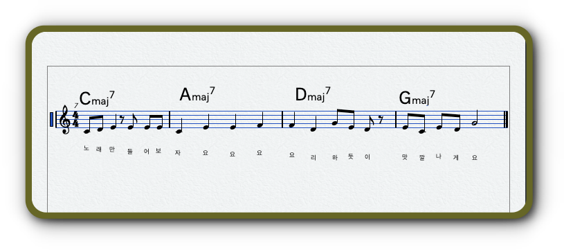 작곡자가 저렇에 가멜로디 와 화성 코드를 만들어 냈어. 다음으로 작사에 의해 멜로디에 가사가 만들어 졌지.